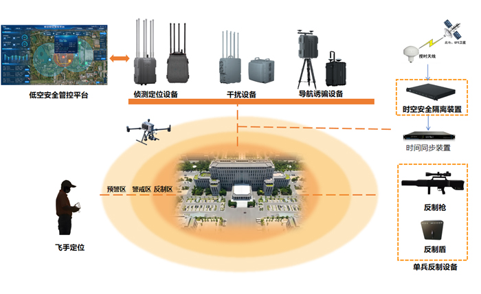 反無人機主動防御系統通過無人機偵測定位設備對重要目標周邊進行無線電偵測,當發現有無人機抵近時,自動校驗是否在白名單內,如屬于“黑飛”,自動啟動反制設備,進行無線電干擾或者導航誘騙,使其迫降或遠離,進而實現24h持續反恐防黑飛工作,且無需人員值守。此外,還可配置單兵反制裝備,輕便靈活、易部署,滿足機動任務需求。